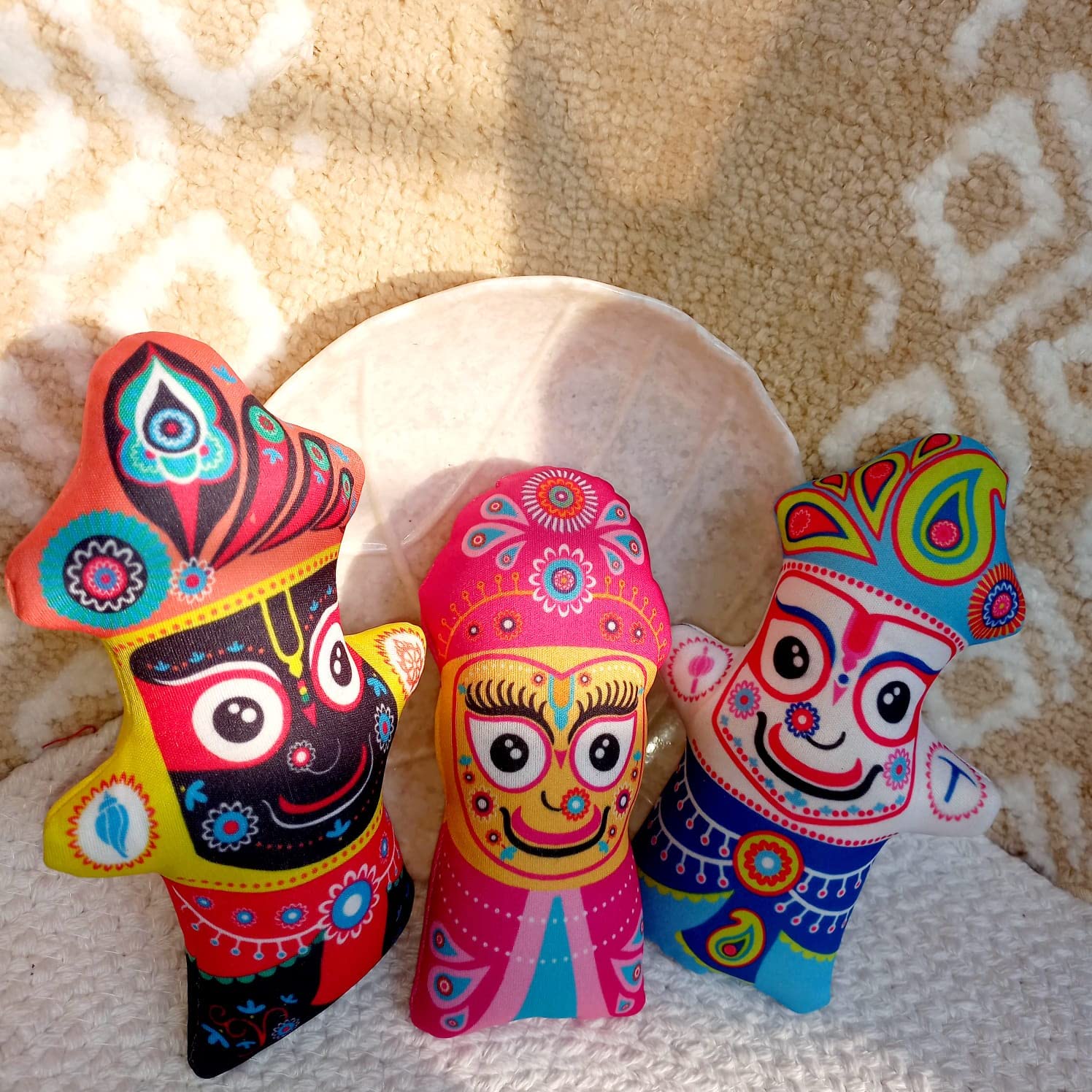 Bring divine energy into your home with this beautifully designed washable soft toy set of Lord Jagannath, Baldev & Subhadra Ji — now in a child-safe, vibrant plush form!