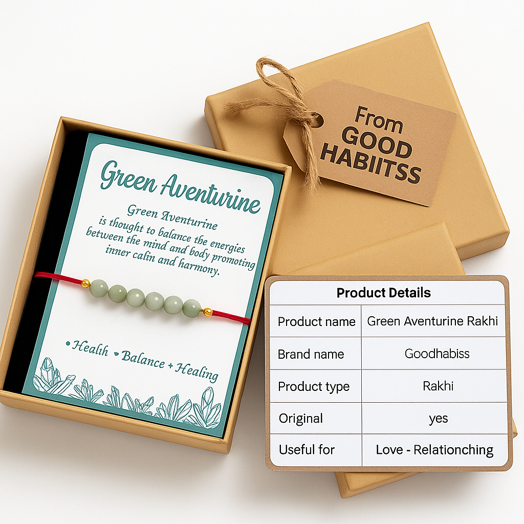 This rakhi is made from natural Green Aventurine crystals, known to soothe emotions, attract good luck, and strengthen the heart chakra 💚