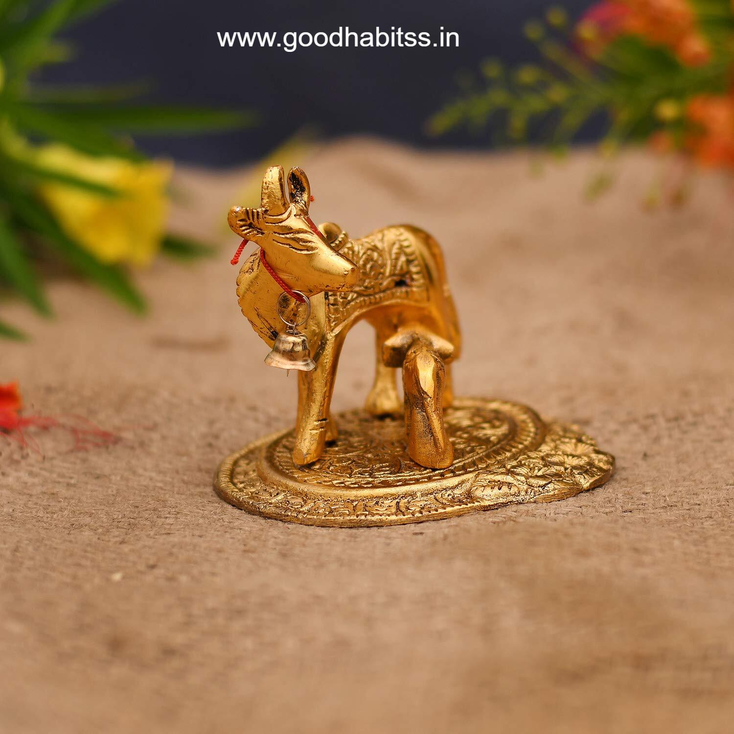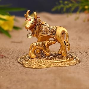 Collectible India brings you an unique antiques religious kamdhenu cow with calf standing on metal base. The product is Gold plated with antique finish so looks very beautiful and use for the purpose of worship and for home decorative. It's design to looks traditional stylish and inspiration from the day's of royal touch. Beautiful creation of kamdhenu cow & calf is a perfect symbol of the undying aura of the holy saint that encompasses numerous devotees round the globe. This statue aptly conveys the emotions of people who consider cow (gomatha) as a motherly figure. Kamdhenu cow & calf statues are widely used for decoration purposes in homes and offices. It serves as a great gift, especially around religious celebrations and festivities.